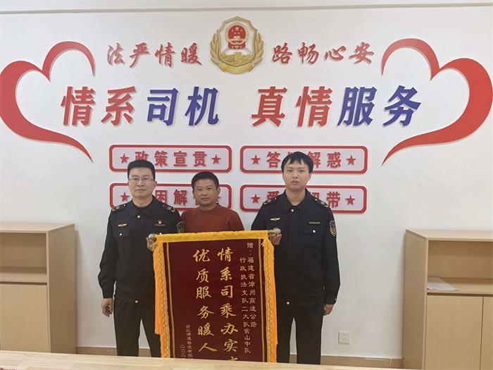 12月4日,浙江某物流运输企业负责人带着一面写有"情系司乘办实事 优质服务暖人心"的锦旗,专程来到漳州高速执法支队二大队常山中队,对执法人员多次协助其公司大件运输车辆解决通行难题表示衷心感谢。